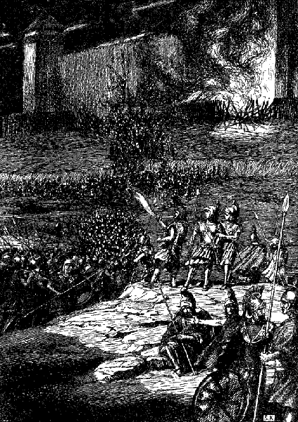 Следующий залп осыпал город сотнями тяжелых камней. И в это самое время греки с криком бросились на штурм, полезли в город с осадных башен и по штурмовым лестницам.