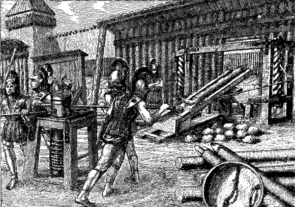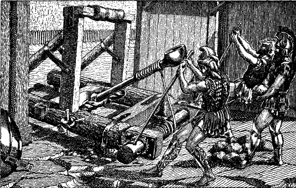 Пять-шесть воинов стали у каждой машины и начали воротами оттягивать ее толстый канат. После долгой утомительной работы машины были готовы к действию. Каждая из них бросала бревно или тяжелую каменную глыбу, весом килограммов до 40-50.
