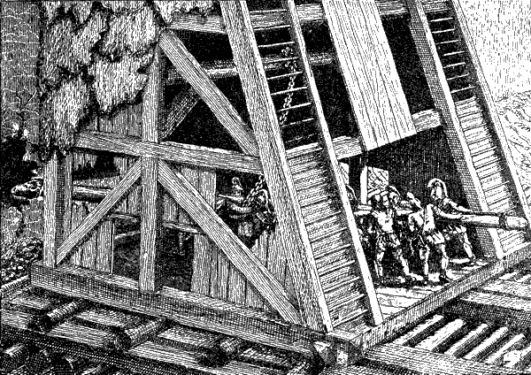 Едва башня подошла вплотную к городской стене, как греческие воины начали раскачивать тяжелое бревно, висевшее на цепях в нижнем этаже (рис. 5), и, раскачав с силой, ударяли в стену. На конце бревна был тяжелый металлический наконечник.