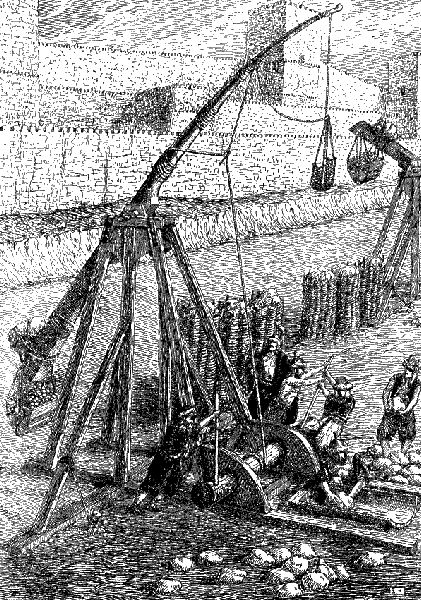 Были осадные машины и другого типа – катапульты. Основанием этой машины служила рама из толстых окованных бревен. Две толстые стойки с перекладиной напоминали ворота. Нижний конец бревна, верхнюю часть которого выдалбливали наподобие ложки, был продет сквозь туго скрученные канаты из воловьих кишок.