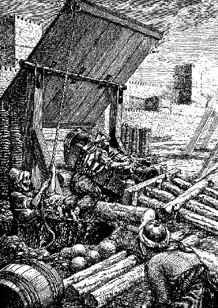 Рис. 9. Бомбарда заряжена; поджигают фитиль