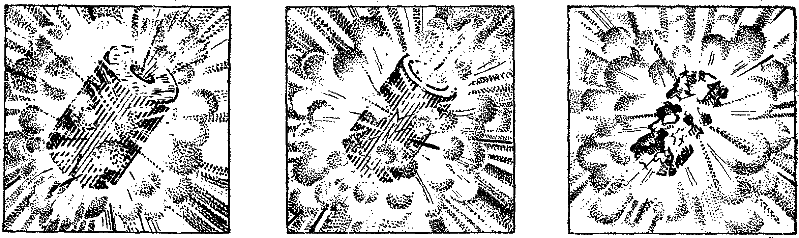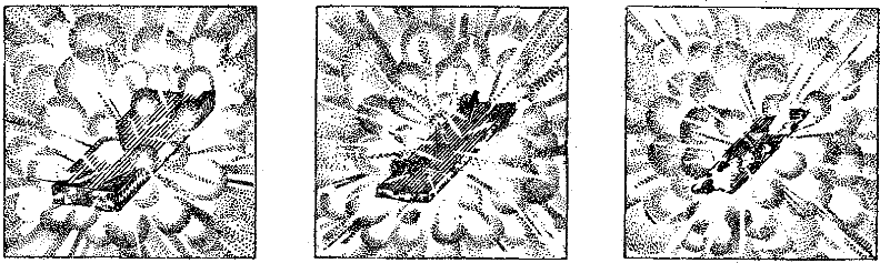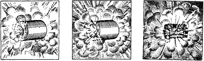 Рис. 67. Когда граната углубляется в землю, получается глубокая «воронка», а осколки летят вверх