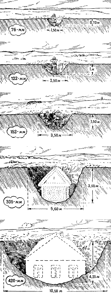 Рис. 60. Такие воронки получаются при разрыве гранат разных калибров, если взрыватель установлен на фугасное действие