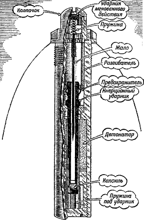 Казалось бы, такая конструкция проста и удачна. Однако в ней был бы существенный недостаток. Ведь если мы уроним снаряд с таким взрывателем при переноске или при погрузке, или просто сильно встряхнем его на каком-нибудь ухабе дороги, ударник непременно сдвинется, капсюль наколется на жало, и взрыва не избежать. О таком взрывателе «простого устройства» смело можно было бы сказать, как и об орудии четырнадцатого века, что он более опасен своим войскам, чем противнику.