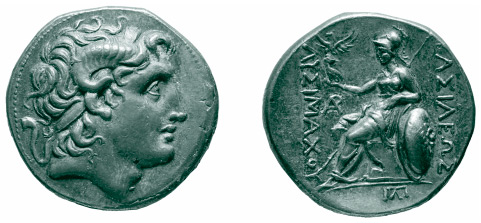 Серебряная тетрадрахма с головой Александра Македонского и Афиной на реверсе. Ок. 297–281 г. до н. э.
