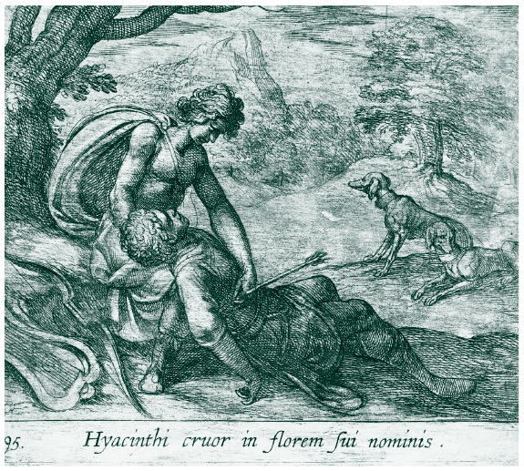 Несчастный хвастун выбыл из игры, но у Аполлона появился еще один соперник – неистовый и разрушительный бог западного ветра Зефир. Тем не менее какое-то время Аполлон и Гиацинт наслаждались обществом друг друга, охотясь в густых лесах на склонах гор или развлекаясь гимнастикой, в которой были так искусны спартанцы. Однажды они решили посоревноваться в метании диска, но игра обернулась трагедией. Аполлон бросил диск, и Гиацинт побежал за снарядом, чтобы метнуть в свою очередь. Но в это время ревнивый Зефир резко дунул, и подхваченный воздушным потоком диск ударил Гиацинта в висок. Хлынула кровь, и юноша умер на месте. Из крови Гиацинта, омывшей траву, вырос алый цветок, названный его именем.