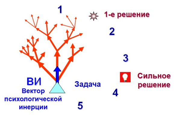 Попробуем разобраться, почему, используя метод проб и ошибок, получают слабые решения. Решая задачи, специалист, прежде всего, опирается на свои знания и опыт. Это хорошо, когда он решает известные ему типы задач. При решении принципиально новых задач такой опыт подсказывает уже известные пути, которые в данном случае не помогают, а тормозят процесс. Эти решения, как правило, уже были опробованы, иначе задача была бы решена. Такой опыт оказывает «медвежью услугу». Память подсказывает уже известные решения, навязанные психологической инерцией. Это понятие также называют «инерция мышления» или «психологический барьер». Поэтому вектор психологической инерции всегда направлен в сторону слабых решений.