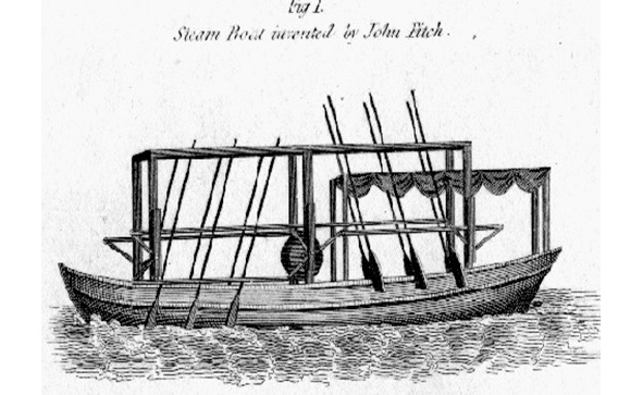 Первое паровое судно, построенное в конце XVIII века американским изобретателем Джоном Фитчем (John Fitch), приводилось в движение… веслами. Гребцы были заменены паровым двигателем, в остальном старый принцип действия корабля не изменился (рис. 1.4). А главное, что движители (весла) были оставлены от старого судна.