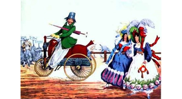 Первый автомобиль повторял форму привычной коляски. Паровой двигатель этого автомобиля был расположен впереди в специальном кожухе, выполненном в форме… крупа лошади. Интересно, что и управление этой машиной осталось традиционным. Повороты осуществлялись с помощью привычных… вожжей. Посмотрите на карикатуру того времени (рис. 1.6).