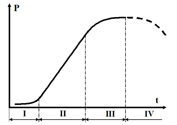 В начале система развивается медленно (этап I), при достижении определенного уровня ее развитие ускоряется (этап II) и после достижения некоторого более высокого уровня скорость роста уменьшается и в конечном итоге рост параметра системы прекращается (этап III), что означает появление в системе некоторых противоречий. Иногда параметры системы начинают уменьшаться (этап IV) – система «умирает». IV этап характерен не для всех систем. Некоторые системы так и остаются на III этапе.