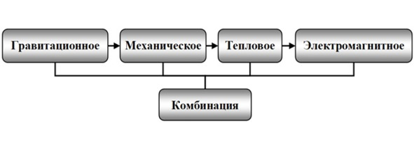 Замена вида поля на более управляемое поле может осуществляться в следующей последовательности: гравитационное, механическое, тепловое, электромагнитное и любые комбинации этих полей. Эта закономерность показана на рис. 1.6.