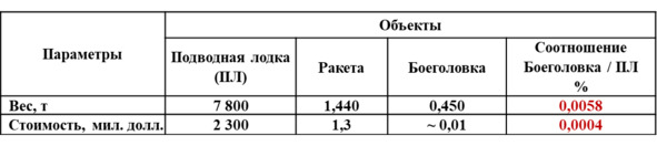 В качестве примера избыточности рассмотрим подводную лодку, которая предназначена для уничтожения объекта противника, например, используя ракеты. Часть ракеты, которая осуществляет разрушение – боеголовка, а еще более точно не вся боеголовка, а взрывчатое вещество (ВВ) – это рабочий орган. Таким образом, для уничтожения объекта противника нужно только ВВ – все остальное избыточно. В табл. 13.1 показаны значения стоимостей и веса подводной лодки, ракеты, боеголовки и их соотношения, на примере атомной подводной лодки класса «Вирджиниа» SSN-7746 (рис. 13.6), вооруженной крылатыми ракетами BGM-1097 (рис. 13.7). Стоимость боевой головки ракеты составляет 0,0004%, а вес боеголовки составляет 0,006%. Соотношение с ВВ будет еще меньшим!!