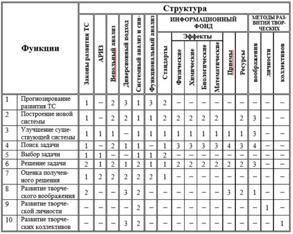 Использование различных элементов ТРИЗ для конкретных функций показано в таблице 2.2: «Функции и структура ТРИЗ».