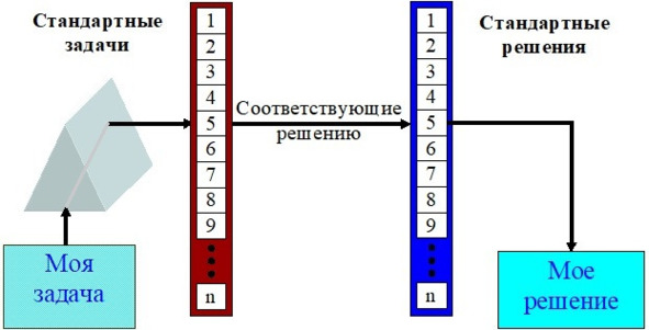Схематично это показано на рис. 2.4. Вы преобразуете вашу задачу с помощью специальных инструментов (на рисунке это показано в виде призмы) в стандартную задачу. Для каждой стандартной задачи найдены стандартные решения и стандартное решение вы используете для получения вашего решения. В случае со стандартами на решения изобретательских задач, в качестве «призмы» используется вепольный анализ.