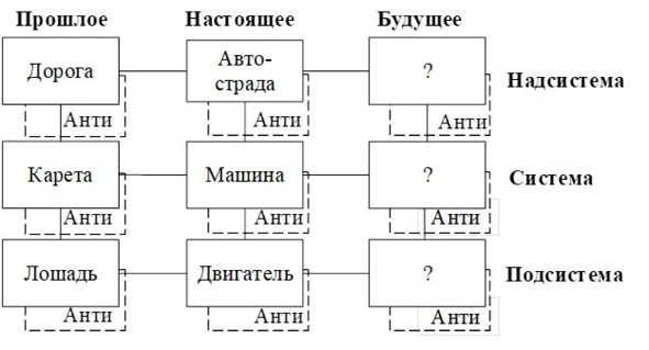 Каждый может себе представить свое будущее. Прежде всего будущее машины зависит от того, из каких подсистем она будет состоять и в какую надсистему она будет входить. Например, уже сегодня разработаны машины с электрическими двигателями, имеются двигатели, работающие на водороде и даже сжатом воздухе. Это все приведет к изменению надсистемы. В будущем будет отсутствовать дорожная полиция – все будет автоматизировано. Автомобили будут «общаться» друг с другом, не допуская дорожных происшествий. Дороги могут походить под землей или над землей, не занимая дорогого места на земле.