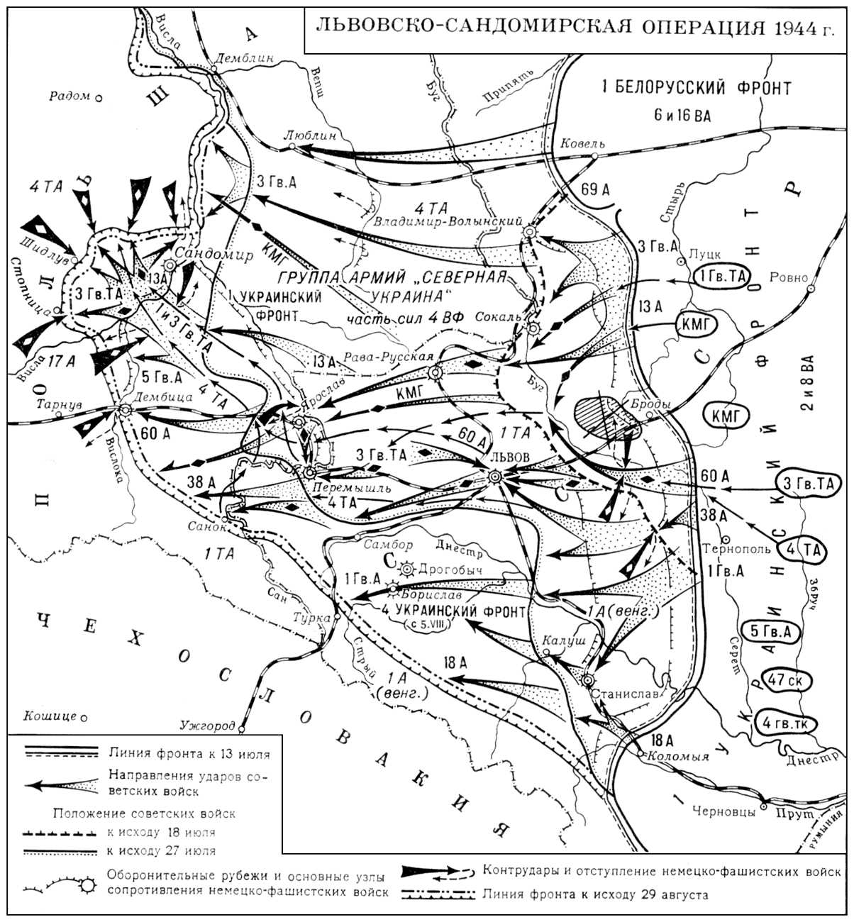 Итак, «Львовско-Сандомирская операция (13 июля – 29 августа 1944) – стратегическая военная наступательная операция РККА против войск нацистской Германии и Венгрии во время Великой Отечественной войны с целью освобождения Западной Украины и занятия Юго-Восточной Польши. Операция входит в число так называемых 10 сталинских ударов.