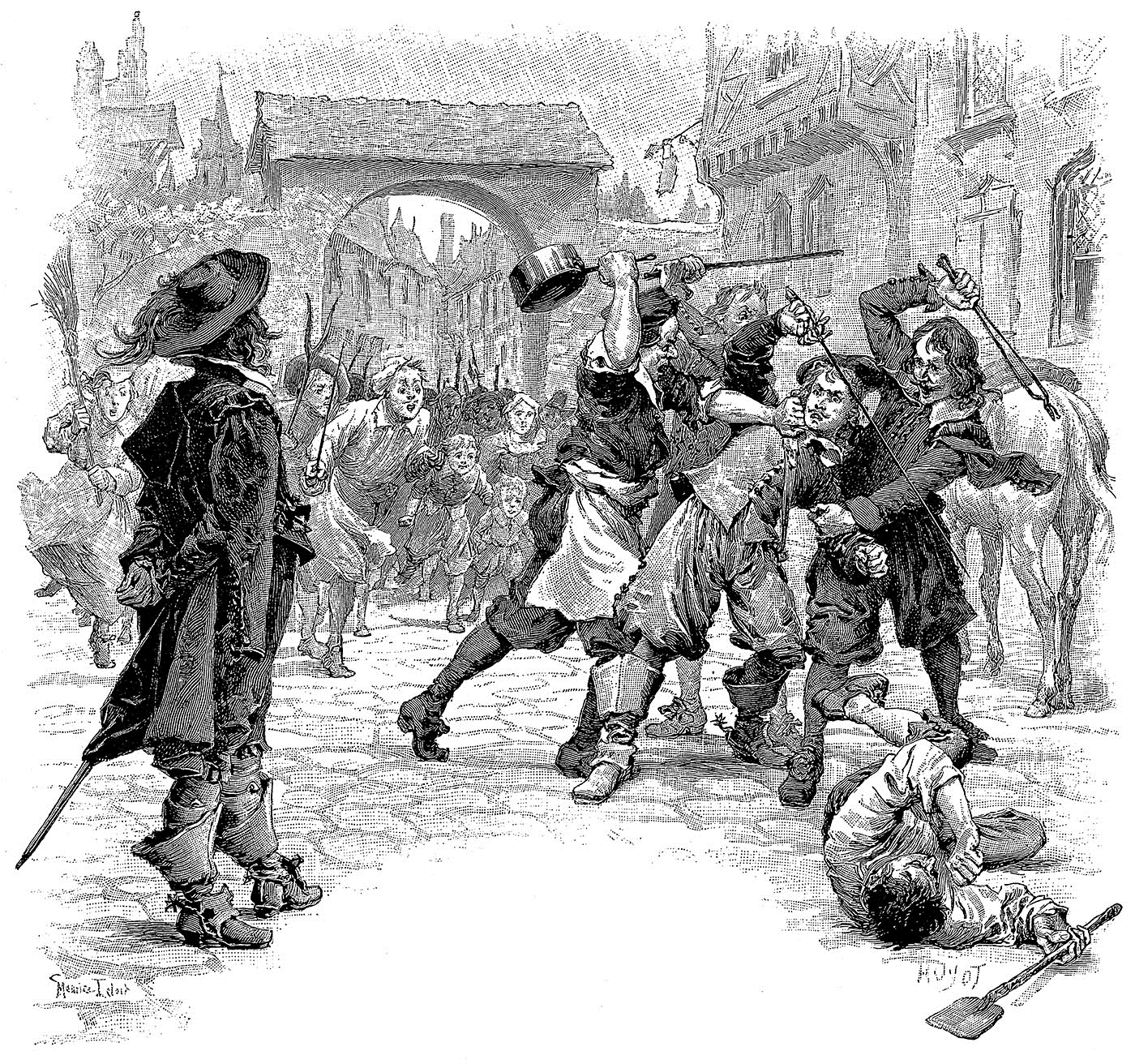 Шутка понравилась мушкетерам, и они были готовы примириться. Но отказаться от вызова считалось недостойным, и Атос и д’Артаньян скрестили клинки, оба надеясь на мирное окончание поединка. В этот самый момент появились пятеро гвардейцев. Они объявили, что хотят арестовать мушкетеров за нарушение закона, запрещающего дуэли. В ответ Портос и Арамис тоже обнажили шпаги. Силы были не равны – трое против пятерых.