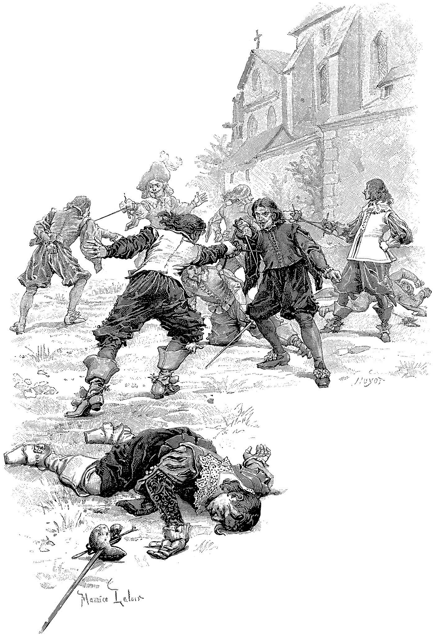 Д’Артаньяну достался самый опытный противник. Его звали де Жюссак, он считался лучшим фехтовальщиком во всей Франции. Д’Артаньян ловко уходил от его ударов, а когда разъяренный гвардеец бросился на него, забыв всякую осторожность, сделал ответный выпад и пронзил его своей шпагой.