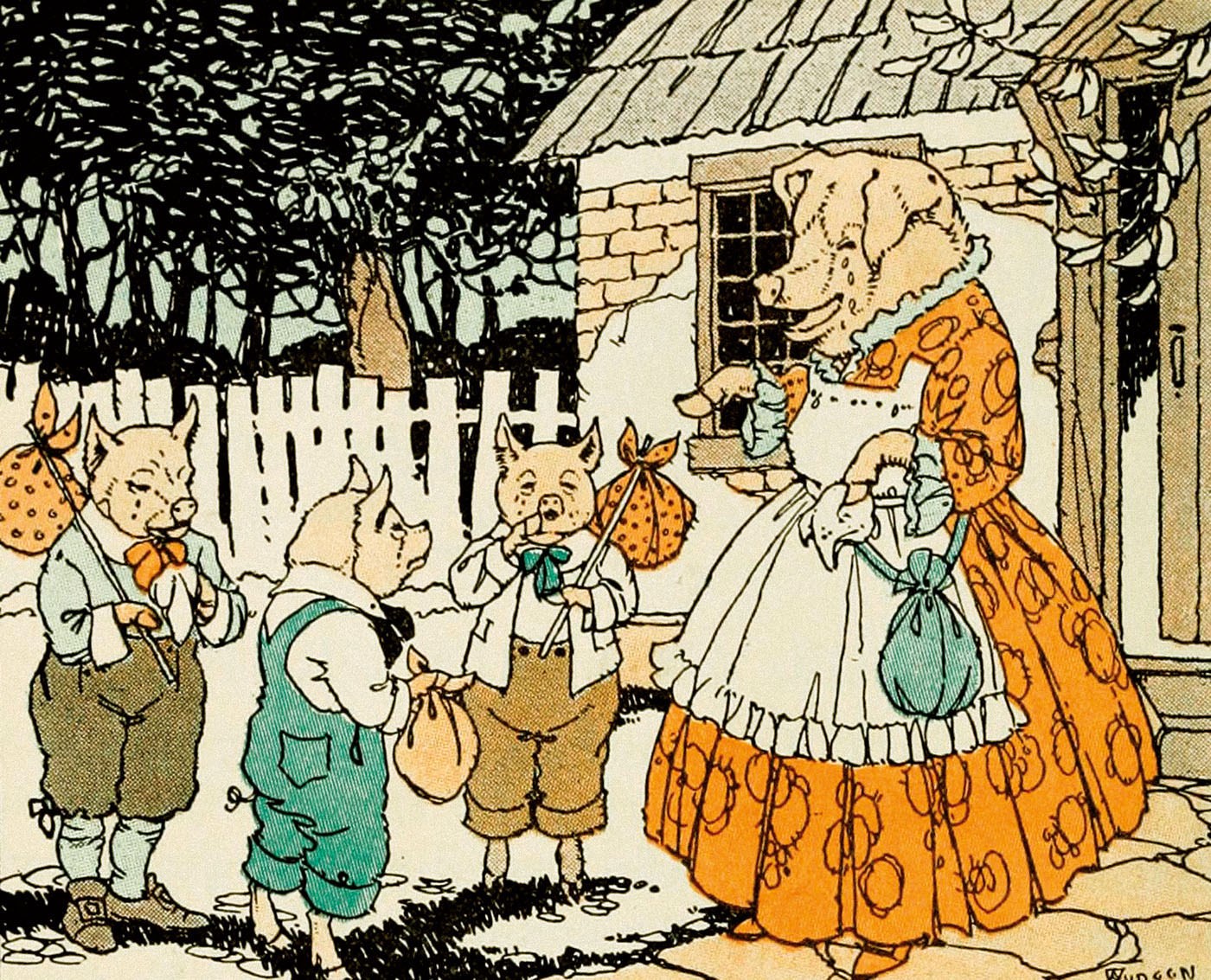 – Мои милые поросята! Вас пригласили во дворец. Но без сэра Свина я не успела обучить вас правилам хорошего тона и поведению при дворе. Как порядочная английская свинья, я не переживу, если вы опозоритесь в обществе, да еще придворном. Поэтому ступайте, походите по белу свету, наберитесь ума-разума. Ведь ничто так не развивает, как путешествия. А когда научитесь хорошим манерам, тогда можно будет подумать и о посещении королевского дворца.
