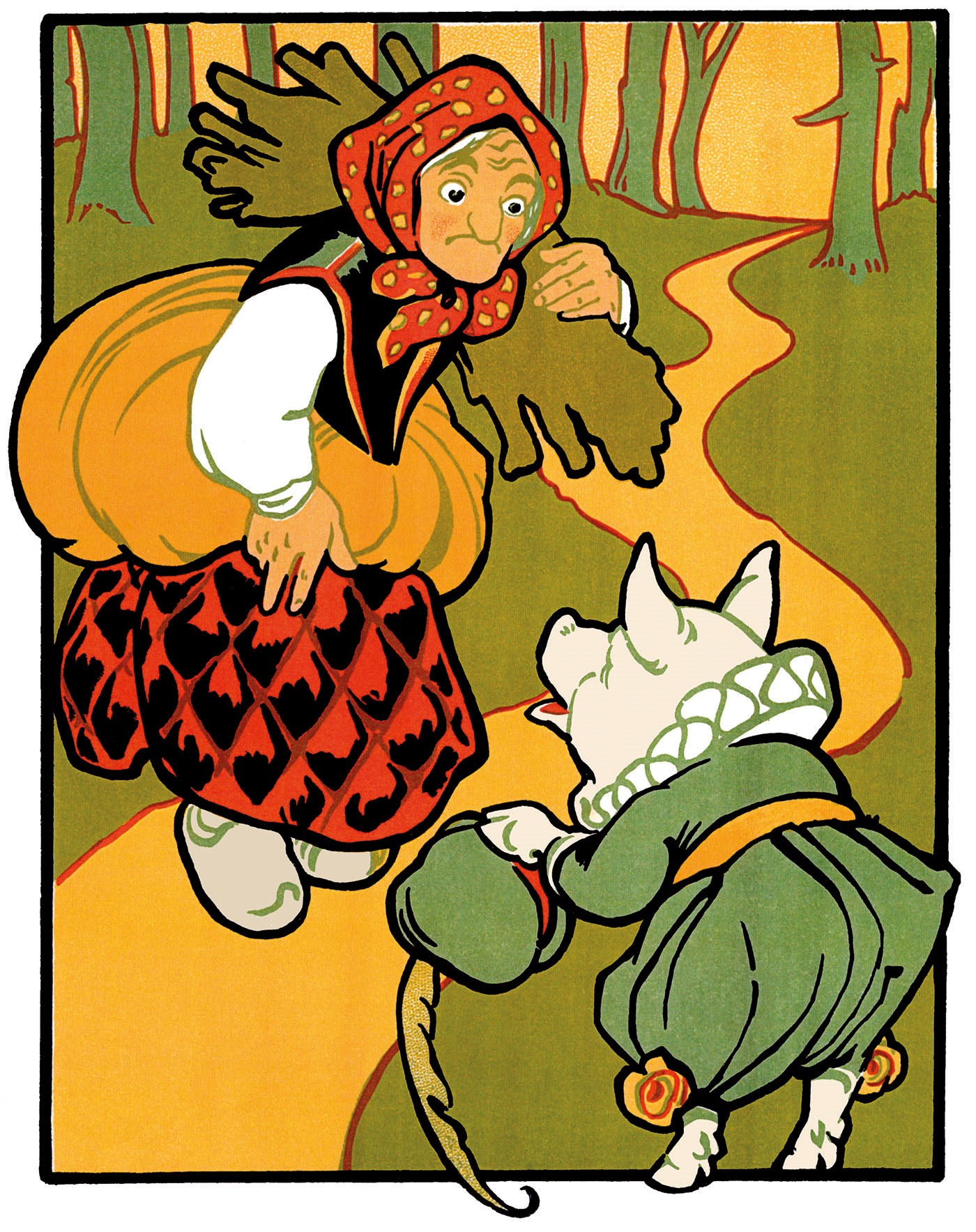 И вот однажды старший поросенок Хрю-Хрю заметил на высоком дереве среди зеленых листьев несколько желтых. Один желтенький листок оторвался от ветки, покружил над полянкой и упал на землю. Хрю-Хрю из любопытства побежал за желтым листочком и вдруг увидел старуху с вязанкой соломы.