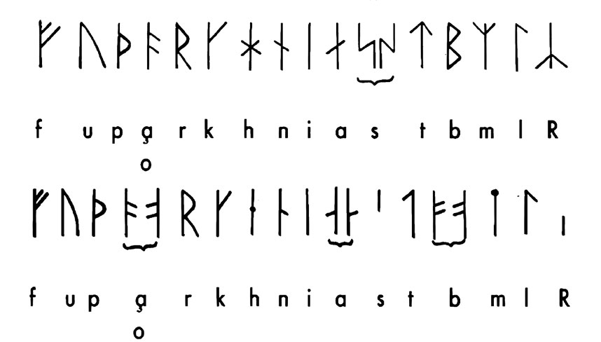 Руническая письменность. Руны быстро распространились у германских народов, в том числе в Скандинавии. Рунические буквы, состоявшие из вертикальных и косых черт, были удобны для того, чтобы наносить их на твердые предметы – каменные стелы, оружие, украшения, ритуальные сосуды – и придавать им священную магическую силу. Каждая руна имела собственное имя, которое начиналось со звука, обозначаемого этой руной. Так, руна т именовалась именем бога – Тюр, руна ф означала богатство (в древнеисландском языке – фйе); на одном памятном (могильном) камне из Южной Швеции руническая надпись гласит: «Хадувольф поставил три руны ф» – жажда богатства не оставляла германцев и после смерти.