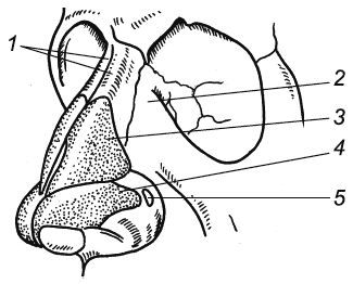Рис. 1. Скелет наружного носа: 1 — носовые парные кости; 2 — лобный отросток верхней челюсти; 3 — треугольный хрящ; 4 — большой крыльный хрящ; 5 — малый крыльный хрящ