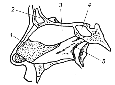 Рис. 2. Носовая перегородка: 1 — четырехугольный хрящ; 2 — лобная пазуха; 3 — перпендикулярная пластинка решетчатой кости; 4 — клиновидная пазуха; 5 — сошник
