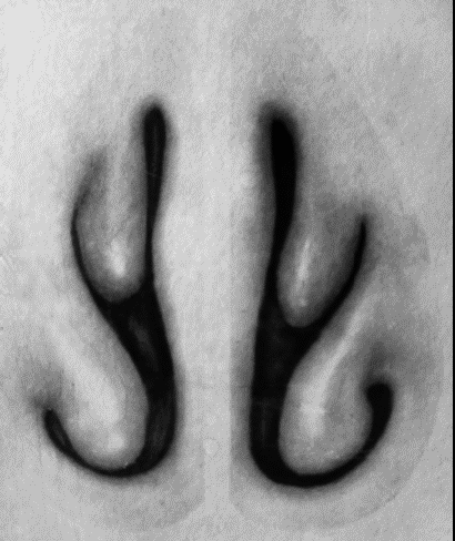 Полость носа разделяется носовой перегородкой на две примерно равные половины. В большинстве случаев она не бывает идеально ровной и может иметь участки изгибов, впадин и выступов (гребней, шипов) (рис. 2, 3), что называют искривлением или деформацией. Врачи на это обращают внимание, так как такие искривления могут препятствовать нормальному носовому дыханию. Образуются искривления носовой перегородки по двум причинам: в результате перенесенных в прошлом травм и переломов (зачастую незамеченных или забытых); в результате неравномерного роста лицевого скелета, когда хрящевые отделы носа (растущие более бурно и быстро) не помещаются внутри костного остова черепа (растущего более медленно) и делают изгибы.