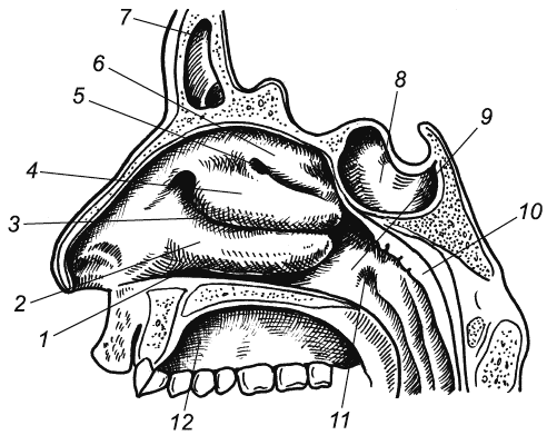 Рис. 4. Строение боковой стенки носовой полости: 1 — нижний носовой ход; 2 — нижняя носовая раковина; 3 — средний носовой ход; 4 — средняя носовая раковина; 5 — верхний носовой ход; 6 — верхняя носовая раковина; 7 — лобная пазуха; 8 — основная (клиновидная) пазуха; 9 — хоана; 10 — аденоидная ткань (глоточная миндалина); 11 — устье слуховой трубы; 12 — твердое нёбо