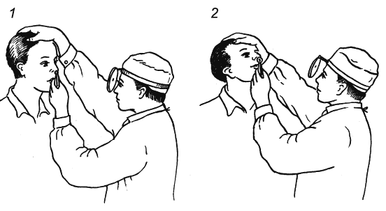 Рис. 5. Осмотр носа пациента (прямая риноскопия): 1 — первая позиция; 2 — вторая позиция