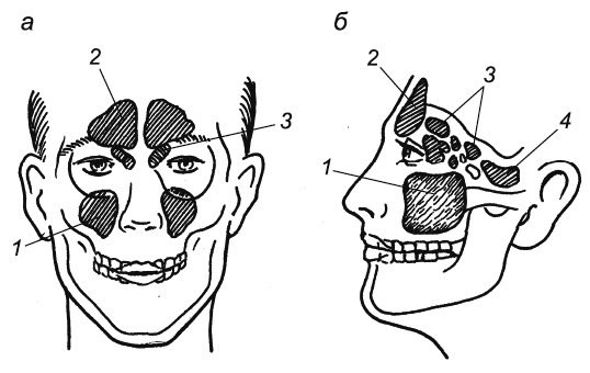 Рис. 6. Расположение околоносовых пазух в голове человека (схема): а — вид спереди; б — вид сбоку; 1 — верхнечелюстная (гайморова) пазуха; 2 — лобная пазуха; 3 — решетчатый лабиринт; 4 — основная (клиновидная) пазуха