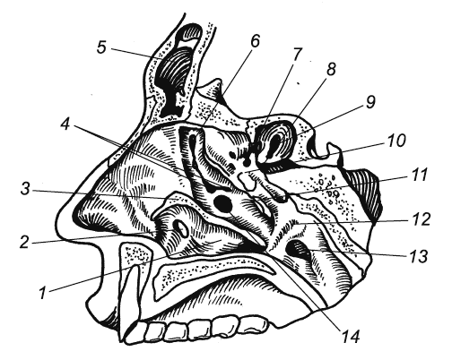 Рис. 7. Вид боковой стенки носовой полости в разрезе (носовые раковины срезаны): 1 — нижний носовой ход; 2 — выходное отверстие слезного протока; 3 — остов нижней носовой раковины; 4 — отверстия передних и средних клеток решетчатого лабиринта; 5 — лобная пазуха; 6 — выходное отверстие лобной пазухи; 7 — отверстия задних клеток решетчатого лабиринта; 8 — выходное отверстие основной пазухи; 9 — основная пазуха; 10 — верхний носовой ход; 11 — остов средней носовой раковины; 12 — хоана; 13 — глоточное отверстие слуховой трубы (в носоглотке); 14 — выходное отверстие верхнечелюстной пазухи