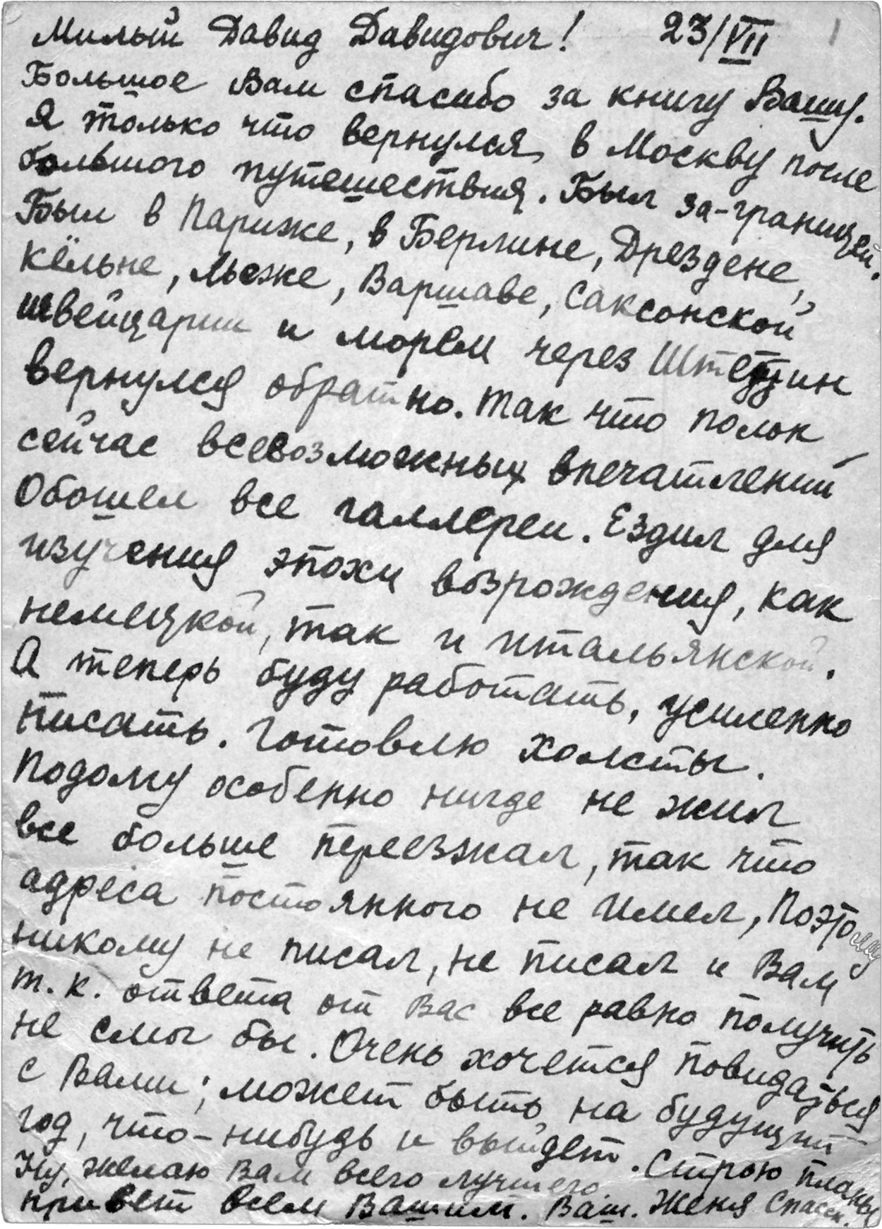 Я только что вернулся в Москву после большого путешествия. Был за границей. Был в Париже, в Берлине, Дрездене, Кёльне, Льеже, Варшаве, Саксонской Швейцарии и морем, через Штеттин вернулся обратно. Так что полон сейчас всевозможных впечатлений. Обошёл все галереи. Ездил для изучения эпохи Возрождения как немецкой, так и итальянской. А теперь буду работать, усиленно писать. Готовлю холсты. Подолгу особенно нигде не жил, всё больше переезжал, так что адреса постоянного не имел. Поэтому никому не писал, не писал и Вам, так как ответа от Вас всё равно получить не смог бы. Очень хочется повидаться с Вами; может быть, на будущий год что-нибудь и выйдет. Строю планы.