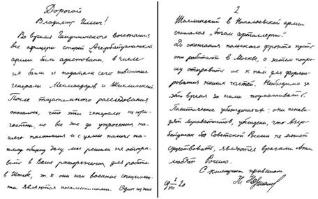 После тщательного расследования оказалось, что эти генералы не причастны, но все же до упрочения нашего положения и с целью помочь нашему общему делу, мы решили их отправить в Ваше распоряжение для работы в штабе, так как они, как военные специалисты, являются незаменимыми. Один из них, Шихлинский, в царской армии считался «богом артиллерии». Политическое убеждение их: они ненавидят мусаватистов, убеждены, что Азербайджан без Советской России не может существовать, являются врагами Англии, любят Россию. До окончания польского фронта пусть они работают в Москве, а затем попрошу отправить их к нам для формирования наших частей. Необходимо за это время за ними поухаживать.