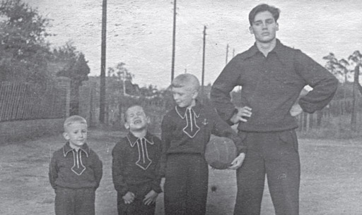 Наша берлинская футбольная команда. Я – крайний справа, мой брат Павлик, второй слева, страшно хочет кое-куда. 1951 г.