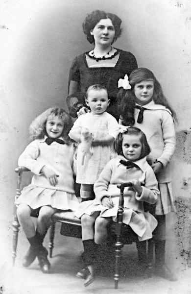 На скамейке справа налево: мама, Жаклин, Кристиан. Стоят: Клер и Эжени Нибуайе. 1915 г.