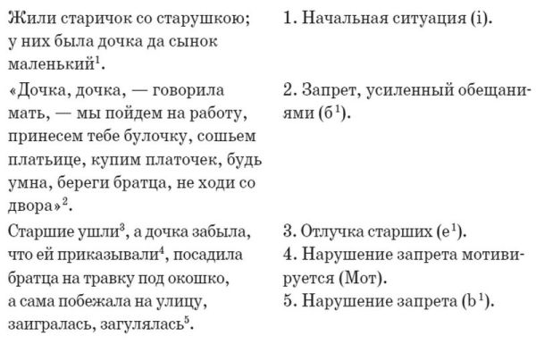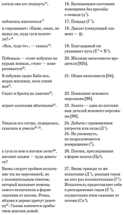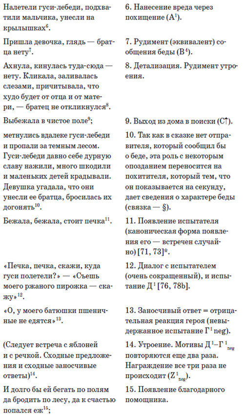 Попробуем же разложить одну какую-нибудь сказку целиком, дословно. Для примера мы выберем очень маленькую одноходовую сказку, самую маленькую сказку нашего материала. Примерные анализы более сложных сказок выделены нами в приложение, так как они важны главным образом лишь для специалиста. Сказка эта – «Гуси-лебеди» (113).