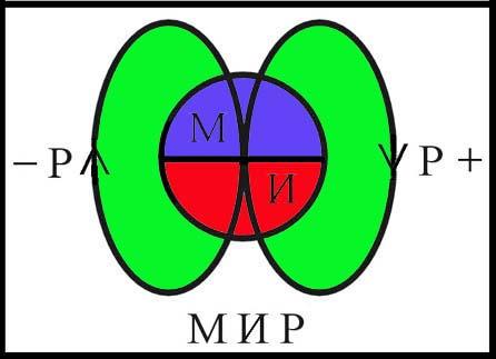 Во Вселенной есть два направления вращения, два преобразующих Вселенную торсиона. Назовём их «посолонь» и «противосолонь» (по Солнцу против Солнца) «правый» и «левый». Представьте себе два вихря-свастики. Одна свастика крутится посолонь, загребая своими лапами вакуум, в её перекрестии есть круглая камера (синий цвет – минус) – там собирается и создаётся материя, – происходит материализация (информация материализируется) с поглощением энергии Ра. Другая свастика противосолонь с красной камерой (плюс) в её перекрестии, она вращается «влево», – она своими лапами разбрасывает материю – дематериализирует её, выделяя энергию Ра (материя отдаёт информацию, смотри пояснительный рисунок «МИР»).