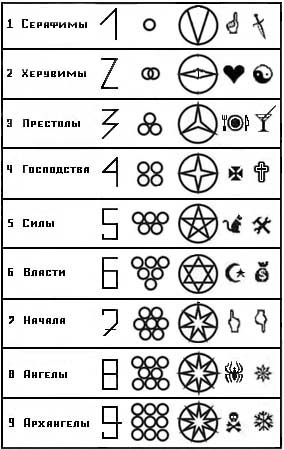 * Используя реконструкцию, на базе исторических и разных религиозных источников, чины ангелов выглядят так, – смотри таблицу. Хотя у евреев чины ангелов выглядят совсем иначе, без всякого порядка и логики, просто небесный бардак, хотя может они в чём-то и правы. За подобное, указанное в таблице деление чинов, выступил Папа Григорий (Римский), по моему мнению, такое деление максимально соотносится с другими источниками. Так называемые «арабские цифры» – это графическое изображение кланов: 1 – один зубчик, 2 – два зубчика и так далее, до девяти углов-зубчиков. Есть также графическое изображение в виде звёздочек, например трёх лучевая, четырёх лучевая, пяти лучевая, шести лучевая и так далее. Вот упоминание в Евангелии об этих чинах:
