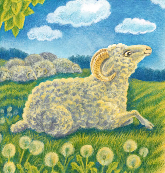 На зелёном лугу, под лучами ярко-жёлтого Солнца дремало стадо овец и баранов.