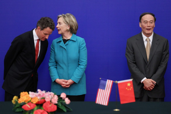 Встреча Тимоти Гайтнера, Хиллари Клинтон и китайского вице-премьера Ван Кишана в Пекине во время конференции по стратегическому и экономическому диалогу в 2010 г.