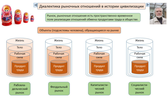На капиталистическом рынке к числу прежних объектов рынка добавляются еще и, обращающиеся в известной степени самостоятельно, подсистемы «тело» и «рабочая сила» наемных работников. А сами наемные работники становятся самостоятельными субъектами обращения на рынке еще и этих человеческих экономических подсистем. Наемные работники самостоятельно решают вопросы своего места проживания, состава семьи, обретения профессии и квалификации, самостоятельно ищут место своей. И только подсистема «продукт труда» каждого наемного работника, являющаяся результатом функционирования купленной капиталистом рабочей силы, не является отдельным и самостоятельным объектом рынка, а обращается на нем, как совокупный продукт деятельности совокупного капиталистического предприятия. И субъектом права собственности на продукт труда всех и каждого наемного работника, субъектом права распоряжения их рабочей силы является капиталист.