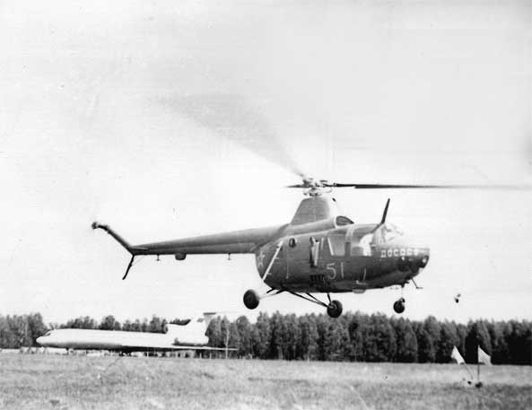 Отработка режима висение на вертолете МИ-1. На заднем плане ТУ-154, выполнивший посадку на грунтовом поле