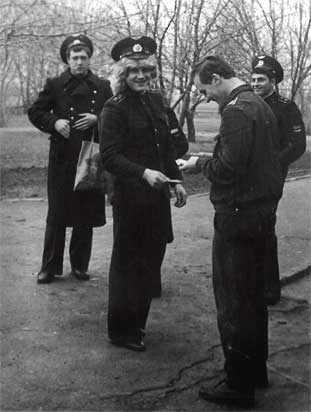 Старшиина Медведев В. выдает Савину В. увольнительную в город