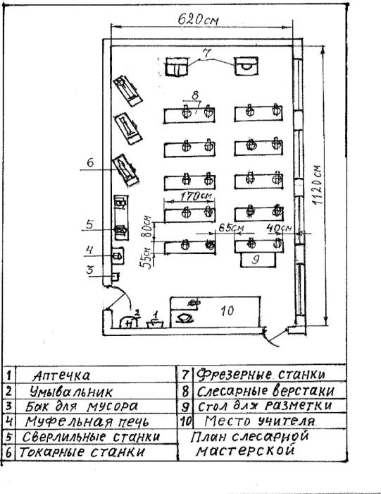 При организации мастерских, надо соблюдать следующие правила: 1. Верстаки ставить ближе к окнам так, чтобы учащиеся были обращены лицом в сторону учителя, а окна, находились слева.