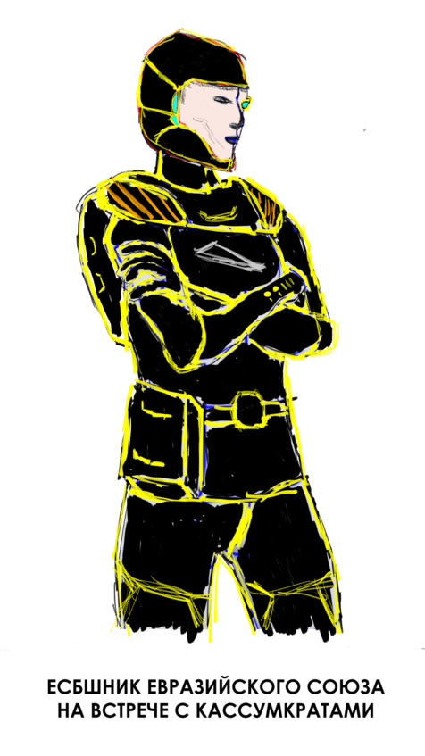 Вице-уполномоченный Президента Евраса Велслав, в сопровождении своей свиты из ЕСБ.[Гвардии] в черных скафандрах со светло-серыми трисоюзами на груди, подошел к семерке молодых людей с ЭПТ «Айсджамп»… Бойцы СВС, без видимого желания, с одолжением, выстроились перед гостями, со скрещенными руками на груди у каждого второго.