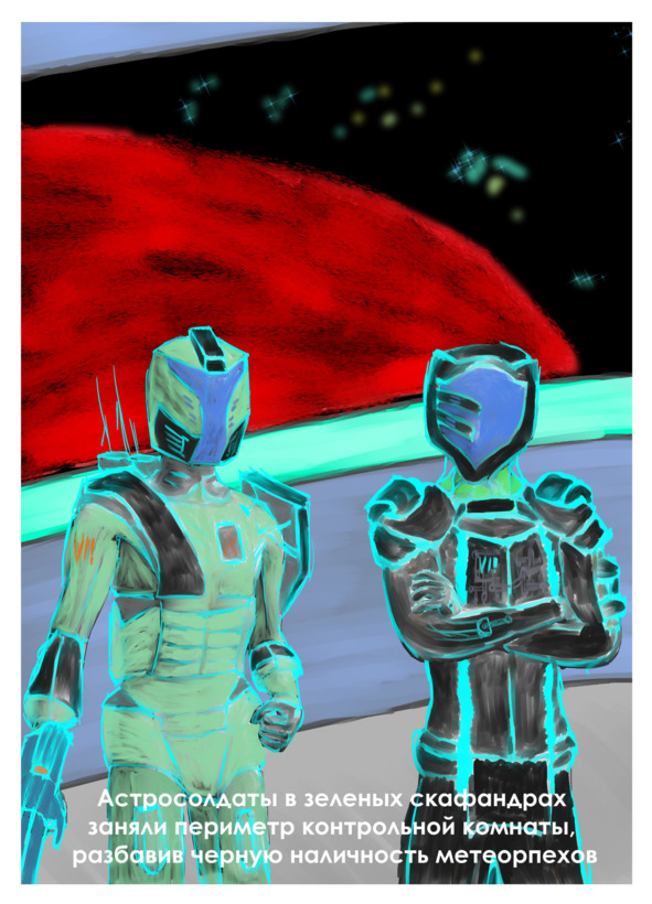 Астросолдаты в зеленых скафандрах заняли периметр контрольной комнаты, разбавив черную наличность метеорпехов.