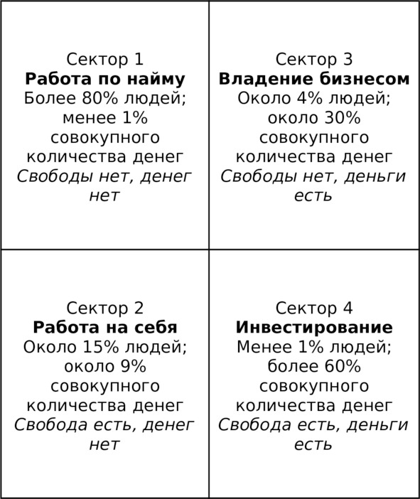Первый сектор – работа по найму. Люди, которые здесь заняты, получают деньги только в том случае, если присутствуют на своём рабочем месте. Заработная плата зависит от объёма и качества выполненной работы. Сам работник в этом секторе старается как можно меньше работать, но как можно больше получать, а работодатель заинтересован в том, чтобы работник делал как можно больше, но получал как можно меньше. Чтобы стать богатым в этом секторе, нужно либо стать специалистом №1, либо делать то, что не умеет делать никто другой.