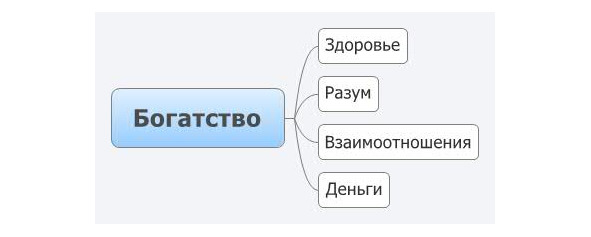 Богатство также бывает внутренним и внешним. Внешнее богатство (взаимоотношения и деньги) прямо зависит от внутреннего. Внутреннее богатство (здоровье и разум) прямо зависит от рационального распределения жизненных сил, времени и денег.