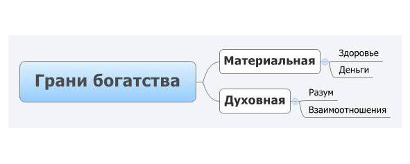 Материальное богатство – это здоровье и деньги (т.е. капитал), а духовное – это разум и взаимоотношения (т.е. нравственность).